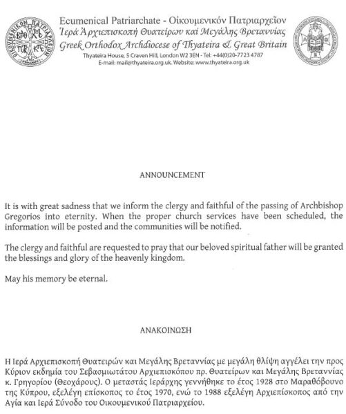 «Σήμερα Τετάρτη, 20 Νοεμβρίου 2019, εκοιμήθη εν Κυρίω ο μακαριστός Αρχιεπίσκοπος πρώην Θυατείρων και Μεγάλης Βρετανίας Γρηγόριος, ο οποίος τους τελευταίους μήνες αντιμετώπιζε προβλήματα υγείας. Ο μακαριστός Ιεράρχης καταγόταν από το κατεχόμενο σήμερα Μαραθόβουνο, ενώ από το 1988 μέχρι και σήμερα υπηρέτησε με όλο του το είναι το Οικουμενικό Πατριαρχείο Κωνσταντινουπόλεως και λάμπρυνε τον Επισκοπικό θρόνο της Ιεράς Αρχιεπισκοπής Θυατείρων και Μεγάλης Βρεττανίας. Η προσωπικότητα του είχε κερδίσει το σεβασμό και την αγάπη όχι μόνο της Κυπριακής παροικίας, αλλά και των κατοίκων του Ηνωμένου Βασιλείου. Πάντοτε στον λόγο του αναφερόταν με θέρμη στα δίκαια του Κυπριακού λαού και του Ελληνισμού εν γένει.Η θλιβερή είδηση του θανάτου του προκάλεσε βαθύτατη θλίψη στον προσφυγικό κόσμο, αλλά και γενικότερα του χριστεπωνύμου πληρώματος της Εκκλησίας της Κύπρου. Ο Πανιερώτατος Μητροπολίτης Κωνσταντίας και Αμμοχώστου κ. Βασίλειος, ο οποίος διατηρούσε άριστες σχέσεις με τον μακαριστό Αρχιεπίσκοπο, ο ιερός κλήρος και το πλήρωμα της τοπικής μας εκκλησίας, εκφράζουν τα ειλικρινή συλλυπητήρια προς την Ιερά Αρχιεπισκοπή Θυατείρων, την ομογένεια στο Ηνωμένο Βασίλειο και προσεύχονται όπως «ὁ Κύριος τῆς ζωῆς καί τοῦ θανάτου νά τόν ἀναπαύσῃ ἐν χώρᾳ ζώντων καί νά χαρίζῃ τήν ἐξ ὕψους θείαν παράκλησιν». Ας έχουμε την ευχή του» αναφέρει.