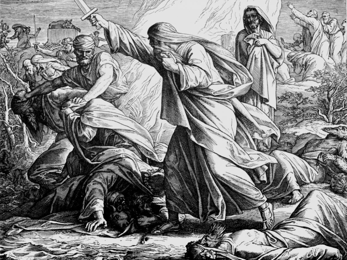 Και ο προφήτης Ηλίας, εμπνευσμένος από αυτό το σημείο, ζήλεψε τον Θεό και διέταξε να συλλάβουν τους ψευδοπροφήτες του Βάαλ, και τους μαχαίρωσε όλους με ένα σπαθί.