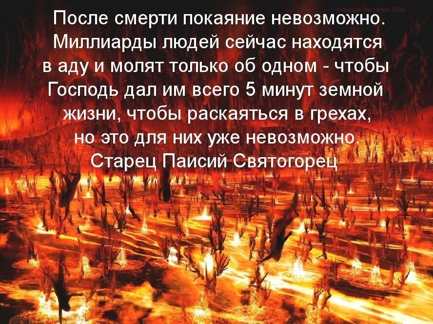 Μην νομίζετε ότι υπάρχει μια ενδιάμεση κατάσταση. Υπάρχει μόνο η κόλαση και ο παράδεισος. Όπως είπε ο αρχιερέας Ντμίτρι Σμιρνόφ: «Αν δεν προσπάθησες να πας στον παράδεισο κατά τη διάρκεια της ζωής σου, τότε μην ελπίζεις για το καθαρτήριο,