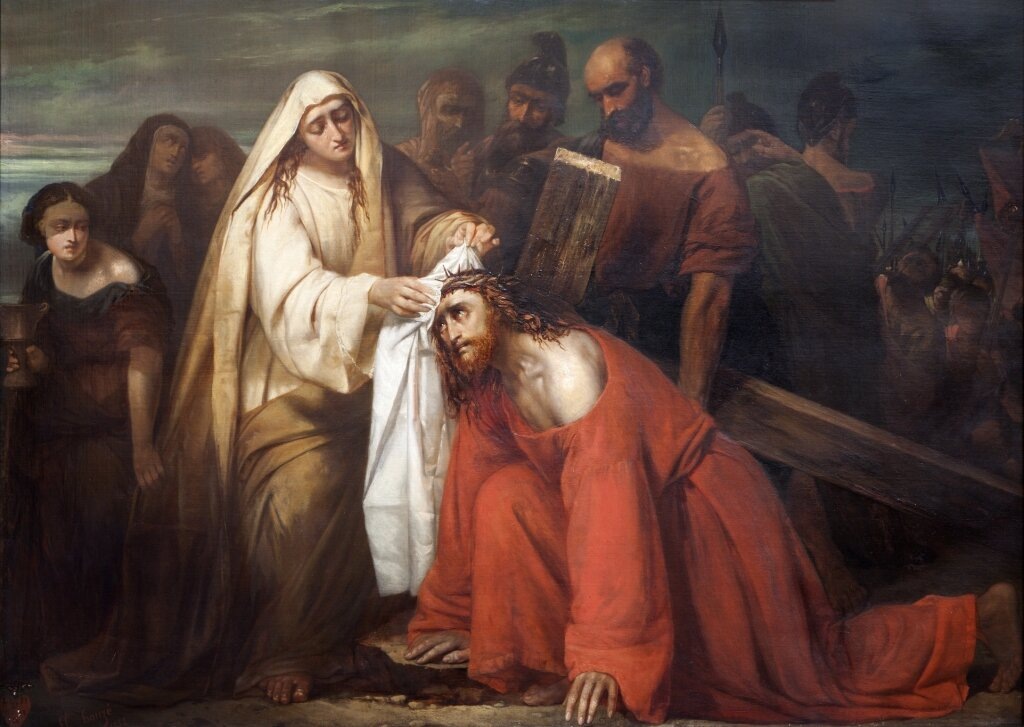 Αυτό το λείψανο συνδέεται με το επόμενο επεισόδιο των Παθών. Όταν ο Ιησούς μετέφερε τον σταυρό του στον Γολγοθά, μια Εβραία γυναίκα ονόματι Βερόνικα ήταν ανάμεσα στο πλήθος που τον συνόδευε. Το πρόσωπο του Χριστού καλύφθηκε με ιδρώτα και αίμα, και η κοπέλα του έδωσε το δικό της πέπλο για να το σκουπίσει. Σύμφωνα με τον θρύλο, λίγο αργότερα, το αληθινό πρόσωπο του Χριστού εμφανίστηκε θαυματουργικά στο πέπλο. Αυτή η σκηνή αργότερα έγινε η βάση για την εικόνα «Η Εικόνα του Χριστού που δεν Φτιάχτηκε από Χειροποίητα».